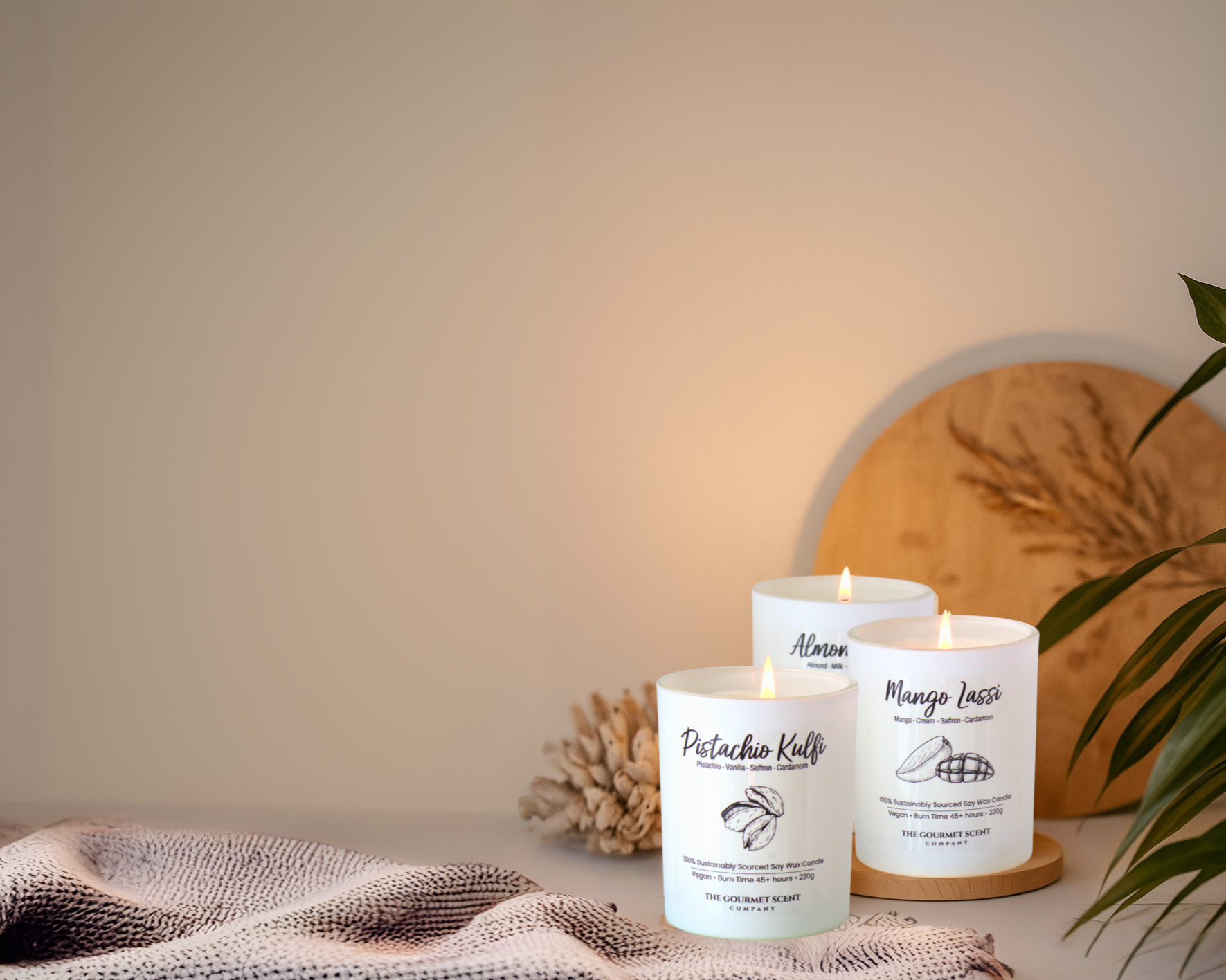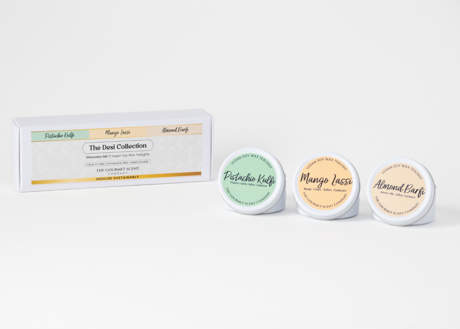 Indulge in the unforgettable aromas of The Desi Collection, our first launch of gourmand, dessert-inspired vegan candles. Classic Indian sweets are reimagined as luxury hand-poured soy wax candles — from the rich, creamy notes of Pistachio Kulfi, to the refreshing sweetness of Mango Lassi, and the delicate nutty warmth of Almond Barfi. Perfect as a sustainable gift or as an indulgence for your own home, these eco-friendly candles bring cherished memories and sensory delight to every space.