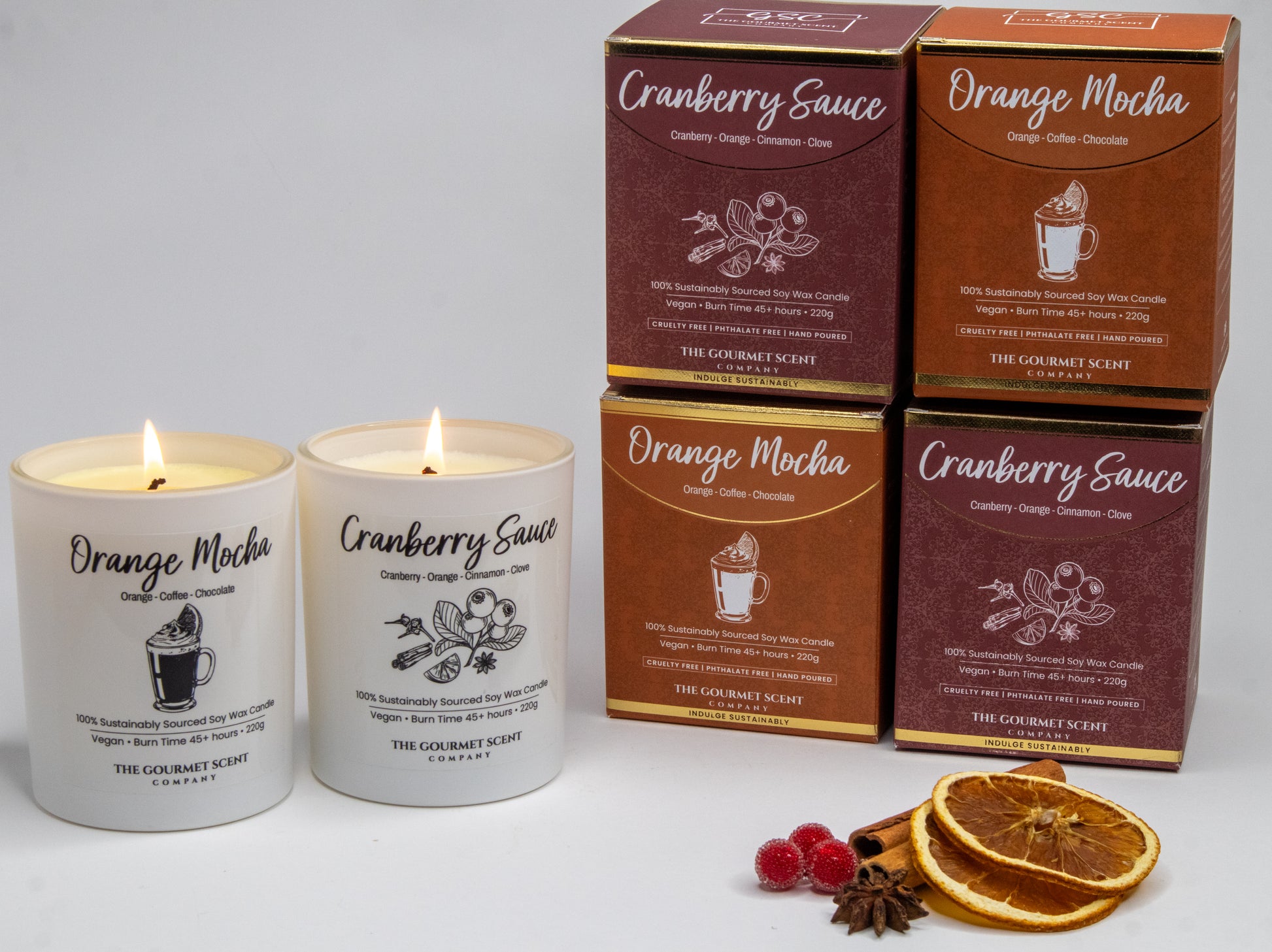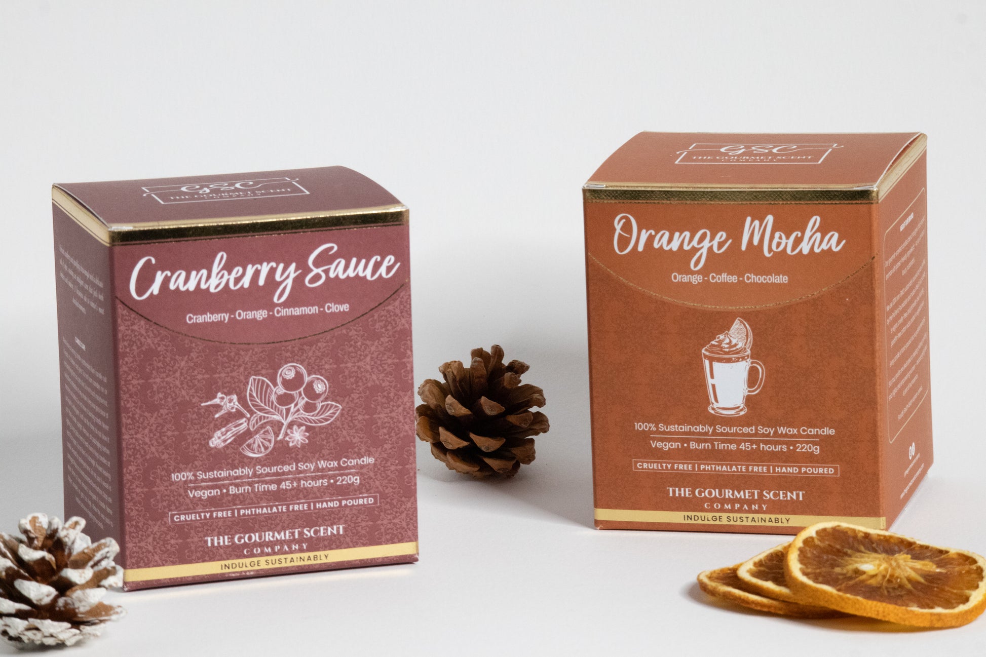 Wrap the season in warmth with our exclusive Winter Collection Bundle — two 220g luxury glass candles in Cranberry Sauce and Orange Mocha. This limited holiday pairing blends tart berries and cosy orange chocolate for the perfect festive atmosphere. Elegant and ready to gift, it’s a thoughtful way to share winter comfort and cheer.